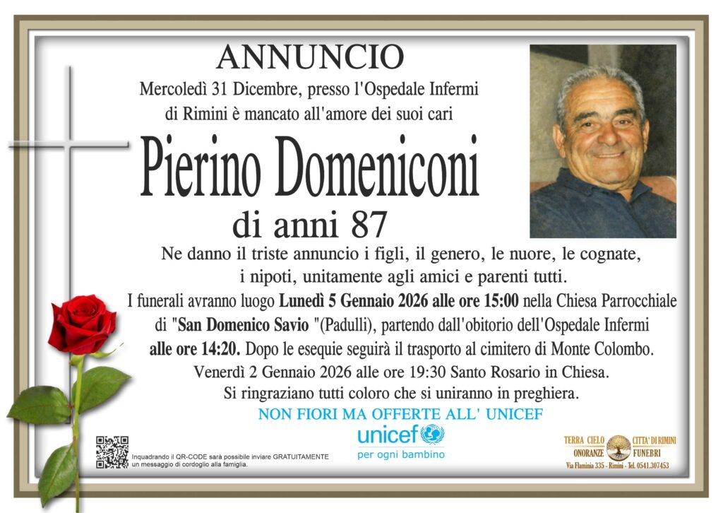 I funerali avranno luogo Lunedì 5 Gennaio 2026 alle ore 15:00 nella Chiesa Parrocchiale