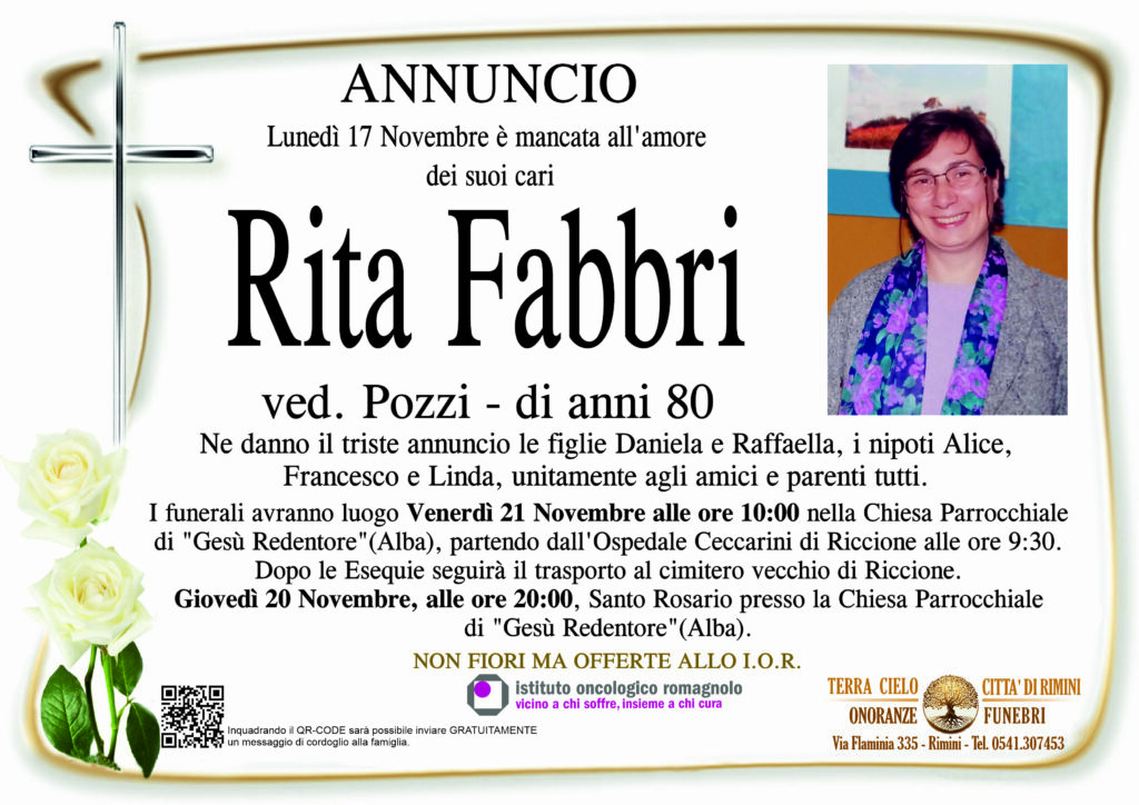 Dopo le Esequie seguirà il trasporto al cimitero vecchio di Riccione.