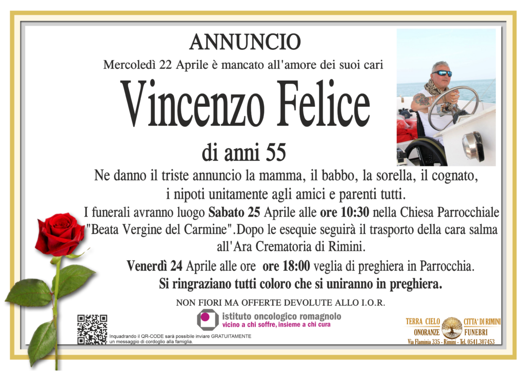 I funerali avranno luogo Sabato 25 Aprile alle ore 10:30 presso la Chiesa parrocchiale “Beata Vergine del Carmine”; dopo le esequie seguirà il trasporto della Cara Salma all’Ara Crematoria di Rimini.